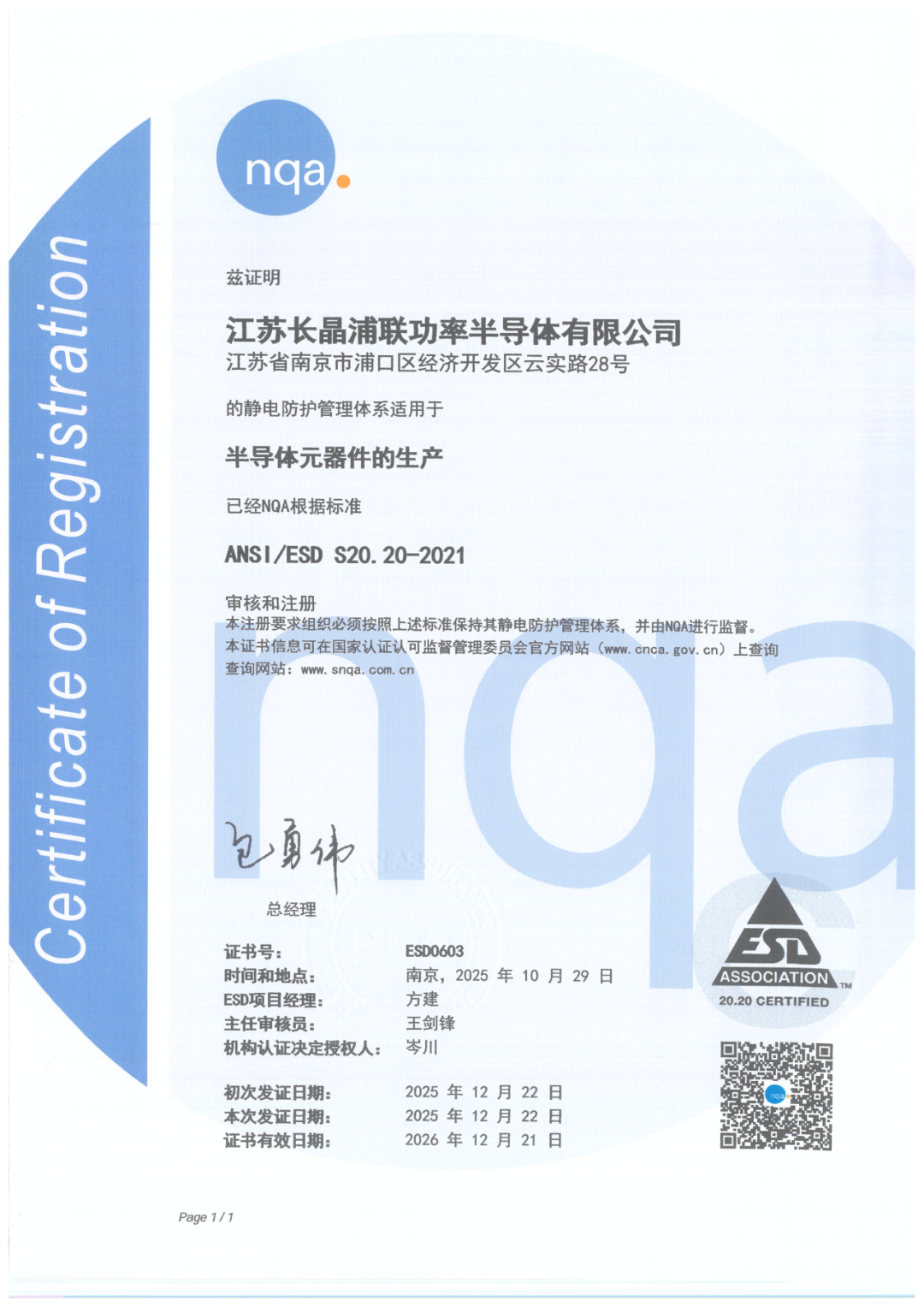 2025年12月,长晶浦联成功通过ANSI/ESD S20.20-2021静电防护管理体系认证,获得国际权威认证机构颁发的管理体系证书。该认证不仅是半导体元器件高精密制造领域的核心准入“门槛”,更标志着长晶浦联在静电敏感产品生产环境控制方面已达到国际先进水平,为高可靠性产品的稳定交付构筑了坚实的质量屏障。