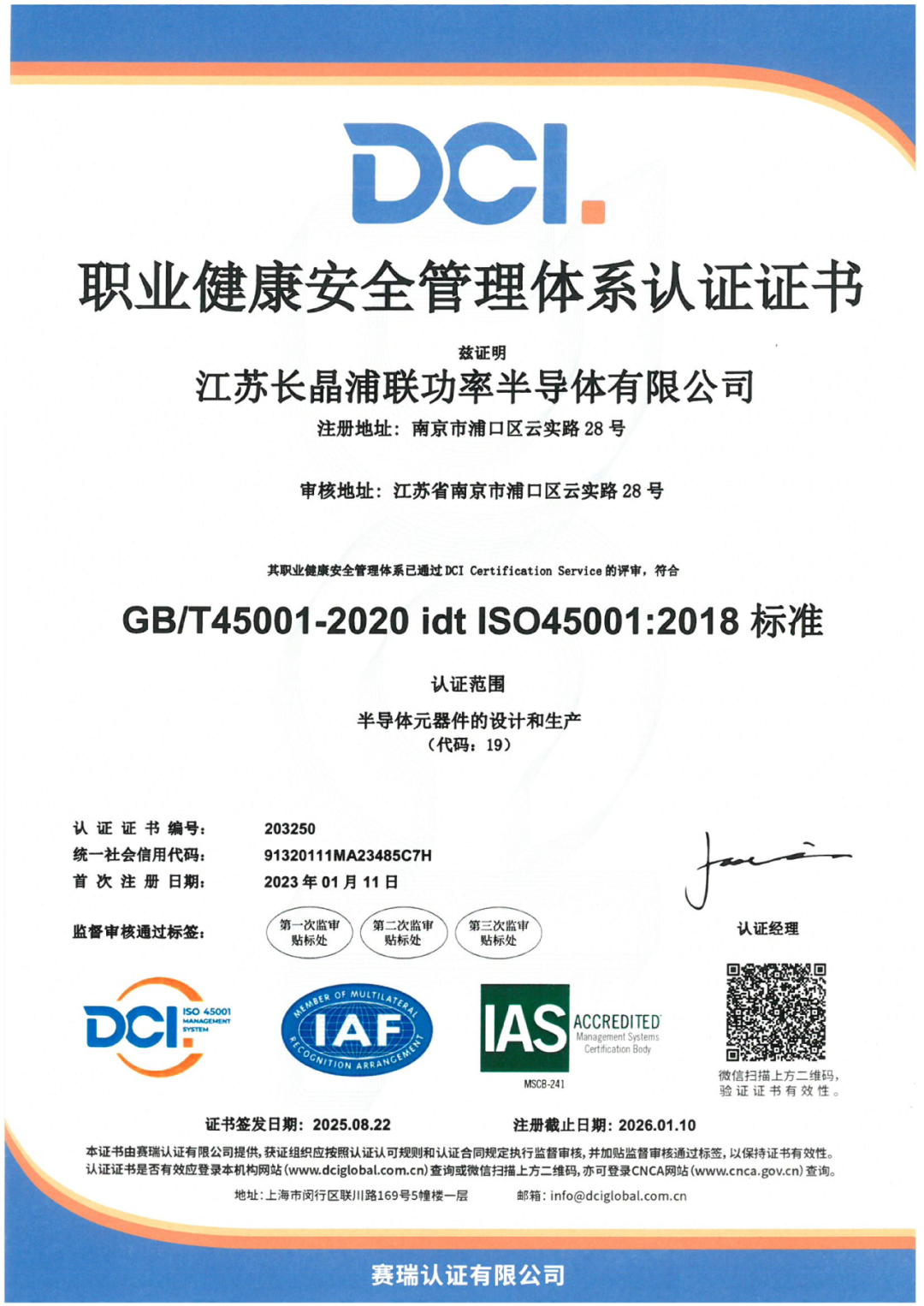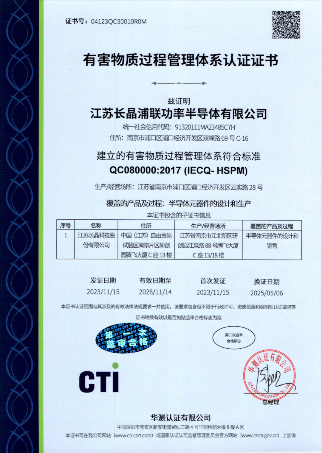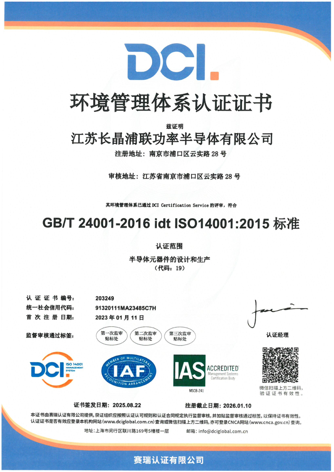 以标准立信,以体系赋能。作为长晶科技布局功率半导体封测的重要一环,江苏长晶浦联功率半导体有限公司自成立以来,始终秉持“全员参与、追求卓越、信守承诺、客户满意”的质量方针,持续构建科学、规范、高效的现代化管理体系。如今,长晶浦联已成功建立覆盖质量、环境、职业健康安全、汽车质量管理及有害物质管控等关键领域的权威管理体系,并不断拓展在静电防护、碳足迹等前沿方向的认证布局,全面支撑半导体高端制造的自主可控和可持续发展。